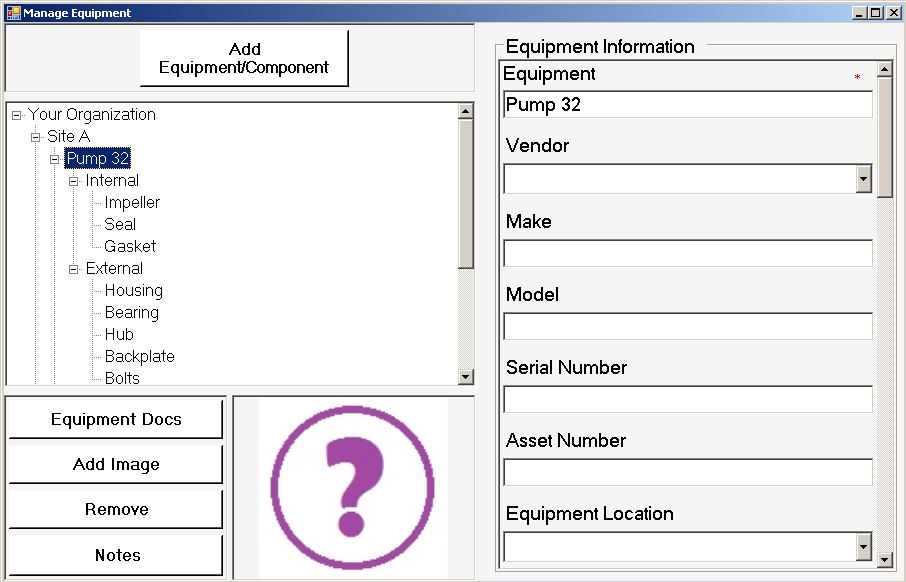 Organize your equipment and other assets hierarchically. Attach relevent notes, documents, and images to each.